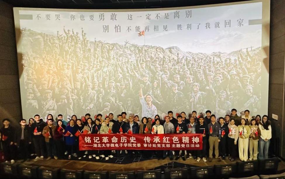 为庆祝中华人民共和国成立75周年,纪念抗美援朝战争胜利71周年,进一步深化爱国主义教育,弘扬爱国主义精神,引导党员同志不忘党员初心,牢记职责使命,2024年11月22日,威廉官方网站微电子公司党委、审计处党支部全体教工党员在绿地巨幕影城开展“铭记革命历史,传承红色精神”联合主题党日活动,集体观看影片《志愿军:存亡之战》。