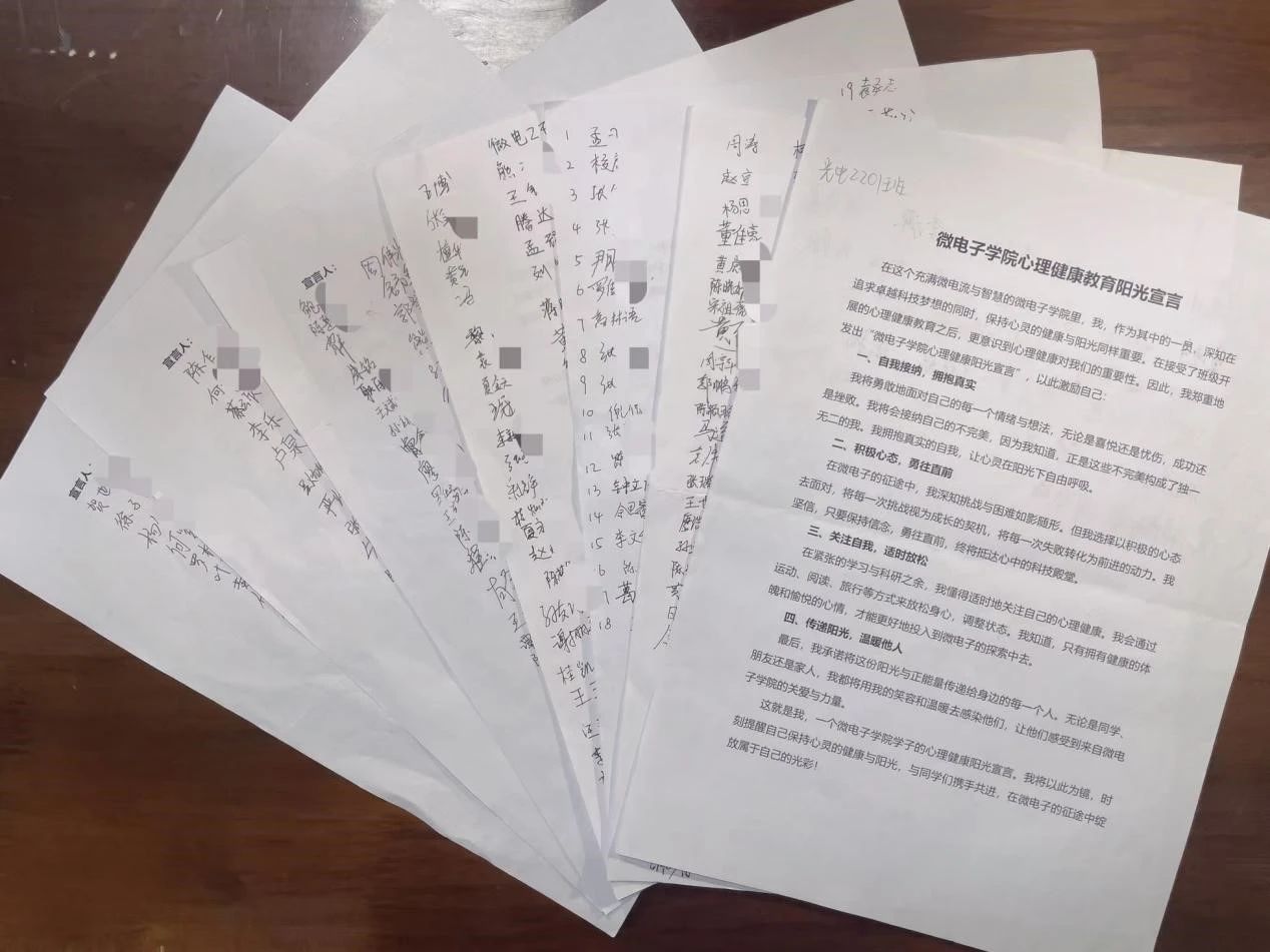 主题班会最后,为鼓励同学们接纳自我、积极向上、充分放松、传递温暖,各班组织签订了《威廉官方网站心理健康教育阳光宣言》,同学们认真阅读了宣言书的内容并签名。