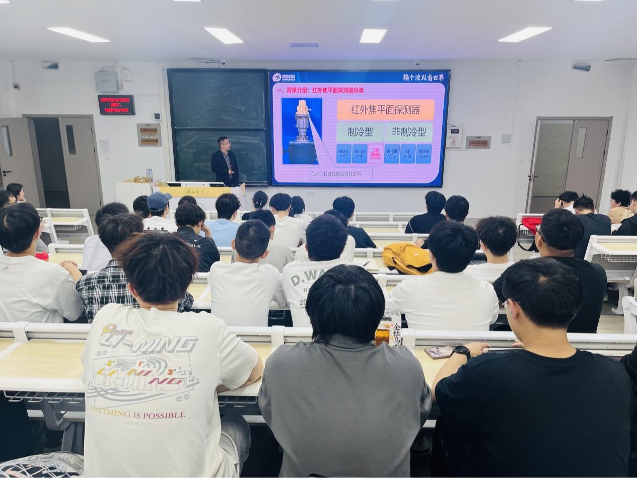 报告伊始,张凡博士立足国家战略需求,系统梳理了超晶格红外焦平面探测器在军事、工业、航空航天以及医疗等关键领域的广泛应用,并详细阐述了当前该领域面临的技术瓶颈。他从半导体器件物理和微电子工艺的角度出发,深入剖析了超晶格红外焦平面探测器的工作原理以及科研产业界的前沿动态,使复杂的理论知识变得通俗易懂,让在场师生受益匪浅。在分享个人经历时,张凡博士介绍了其在宁波超晶光电科技有限公司组建国内首个新型化合物半导体红外焦平面探测器批量生产研发团队的历程。他带领团队成功实现了基于二类超晶格技术的红外焦平面探测器产品的定型和批量生产,为我国在该领域的技术突破做出了重要贡献。张凡博士还强调:“超晶格红外焦平面探测器让我们换个波段看世界,其发展直接关系到国家安全和民生福祉。”他还指出,当前光电探测产业链仍存在诸多“卡脖子”技术问题,而行业对电科、光电、微电子和集成电路人才的需求正急剧增加。他鼓励在场员工珍惜在校时光,学好每一门基础课和专业课,并以自身经历为例,阐述了扎实的专业知识在实际工作中所发挥的关键作用:“等你们毕业后从事生产研发工作,就会深刻体会到当年为什么要学习量子力学、固体物理学和半导体物理等课程。”