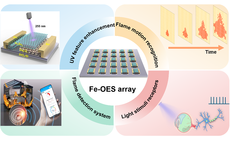 新一代消防安全系统需要对火焰进行精确的检测和运动识别,感存算一体技术成为火焰检测的前沿新兴技术。然而,在日盲紫外线(200 - 280 nm)波段,基于人工视觉系统的硬件层面功能演示受到了探测器检测能力较弱的限制。鉴于此,王浩教授团队历时5年,通过多学科协同攻关,创制出Ga2O3/In2Se3铁电-光电异质结探测器(Fe-OES)阵列(5×5 像素),该阵列通过铁电极化效应显著抑制暗电流、增强光生载流子分离效率,使器件在极弱光强条件下仍具备超高探测率和响应度,同时还具有可配置的多模式功能。在255 nm日盲紫外光照射下,器件探测率最高可达 4.91×10¹⁷ Jones,处于氧化镓基紫外光电探测器领先水平。Fe-OES 阵列可以直接感知不同的火焰运动,并模拟昆虫视觉系统中的非脉冲梯度神经元。结合自研的氧化铌忆阻器LIF神经元硬件,火焰紫外信号能够得到有效放大。如图1所示,该研究成功完成了三项火焰识别任务:通过终端和云端警报实现对所有时间段火焰的高效监测;使用轻量级卷积神经网络实现火焰运动识别;通过光敏人工神经系统实现火焰早期极弱紫外光探测。